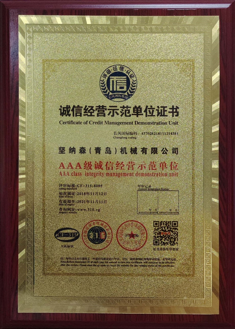 誠信經(jīng)營示范單位證書